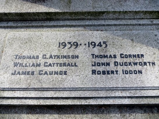 (WW1 names) Henry Almond, Richard Alty, Harry Bannister, John Blackstone, William Blackstone, John Bolton, Robert Bullen, Peter Cave, Harry Cload, James Cottam, Thomas Cottam, Thomas Coulton / Reginald de Trafford, Albert Dickinson, Daniel Dickinson, Richard Eastham, William Eastham, George H. Farrington, Robert Glover, James W. Hough, James Iddon, Robert Iddon, Jonathan Johnson, Henry Lea / James Mayor, Robert Miller, Harold Rawlinson, Robert Rigby, John T. Spencer, Thurstan W. Smith, William Smith, Harry B. Trafford, Henry H. Trafford, William Walsh, Thomas Watkinson, Leo Whittle / (WW2 names) Thomas G. Atkinson, William Catterall, James Caunce, Thomas Corner, John Duckworth, Robert Iddon / William Marsden, Eric Norris, James M. Seddon, R. Edgar Snaylam, Richard Sumner, Sydney Webster