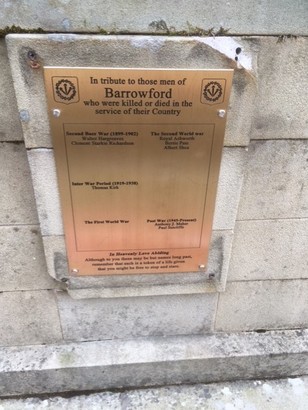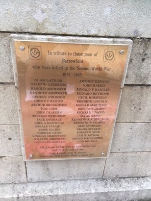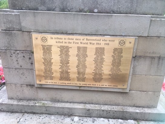 In memory of / our glorious dead / 1914-1918 / 1939-1945 // In tribute to those men of Barrowford who were / killed in the First World War 1914 - 1918 / (names) / Life to be sure, is nothing much to lose; but young men think it is, and we were young // In tribute to those men of / Barrowford / who were killed in the Second World War / 1939 - 1945 / (names) / All I want is for you to remember me / and feel proud of me, / then I shall rest in peace / knowing that I have done a good job.