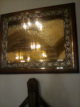 JOHN TAYLOR/1ST KINGS ROYAL RIFLES/FELL AT GLENCOE OCT 20TH 1899; EDWARD SANDERS MACHELL/1ST NORTHUMBERLAND FUSILIERS/DIED AT MODDER RIVER JAN 16TH 1900; JOHN STARKIE PRESTON/1ST ROYAL SCOTS/DIED AT DEWETSDORP JUNE 27TH 1900/