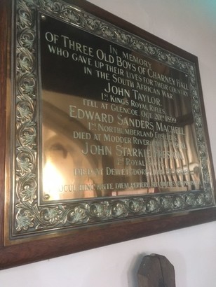 IN MEMORY/OF THOSE OLD BOYS OF CHARNEY HALL/WHO GAVE UP THEIR LIVES FOR THEIR COUNTRY/IN THE SOUTH AFRICAN WAR/[names]/ PROCUL HINC ANTE DIEM PERIERE, SED MILITES, SED PRO PATRIA