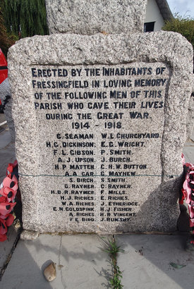 6 o'clock plinth face: ERECTED BY THE INHABITANTS OF / FRESSINGFIELD IN LOVING MEMORY / OF THE FOLLOWING MEN OF THIS / PARISH WHO GAVE THEIR LIVES / DURING THE GREAT WAR. / 1914-1918. / (28 NAMES) // 12 o'clock plinth face: 1939 - 1945 / (5 NAMES) //