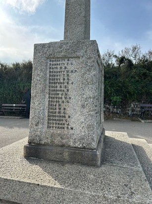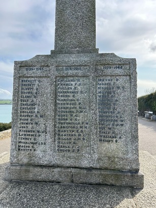 1914-1919. England R, Frazer F A, Fuller E, Greenaway E J, Grubb E, Harding C, Henwood P, Henwood W J,Hocking P W C, Hore W C, Hutchings F W, Langford M H, Martyn E S, Masters W G, Miller J H B, Miller E, Neace F J, Couchh J P, Oldham T F,Oldham T L, Prideaux-Brune E N, Prior E P. Rae J E P, Rosevear W H, Sargent E J G, Skinner G J, Slawson A O, Sluman A C, stone J, Taylor EG, Thomas W H, Tippett J H, Tomkin F C, Willcock J H, Williams AJ, Wood G D. 1939-1945. Bennett G, Bennett L, Bluett H, Brown J, Clemo R, Delf J, England J, England L, England R, Harvey R H, Horn B, Jermyn W, Jury J, Kinsmen W A, Lawrence P, Lanhey C, Maccillivray J D R, Macor C, Martyn S, Mayne R, Moore F, Morgan W C, Moyes E, Murt A, Phelps E, Porter J, Stevens A, Thompson C, Thompson W, Twist B P W, Udy W, Veale R, Williams A, Wright S.