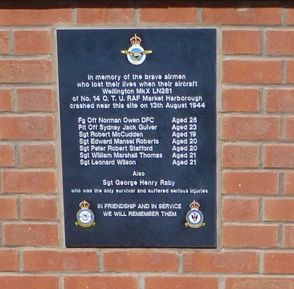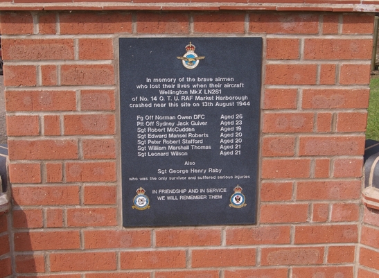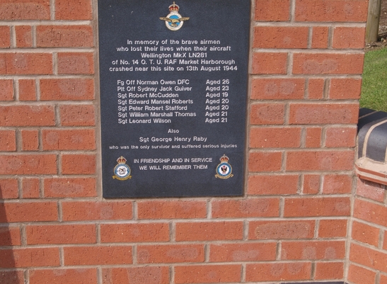 In memory of the brave airmen/ who lost their lives when their aircraft/ Wellington MkX LN281/ of No. 14 O. T. U. RAF Market Harborough/ crashed near this site on 13th August 1944 [Names]/In Friendship and in Service/ We Will Remember Them
