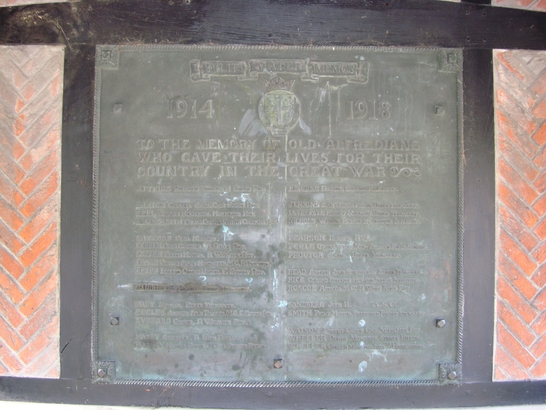 FILIS MATER MEMOR/ 1914 - 1918/ TO THE MEMORY OF OLD ALFREDIANS/ WHO GAVE THEIR LIVES FOR THEIR COUNTRY IN THE GREAT WAR/ (Names)