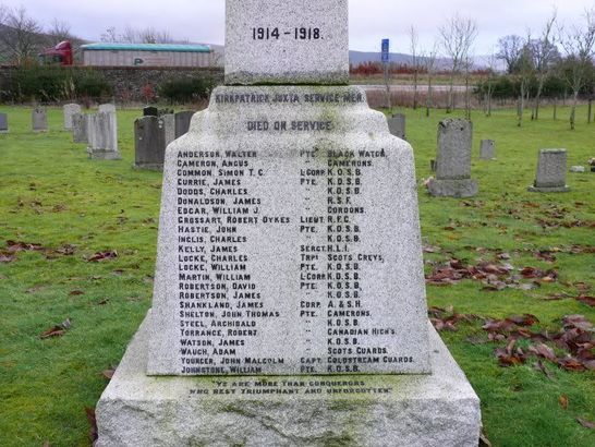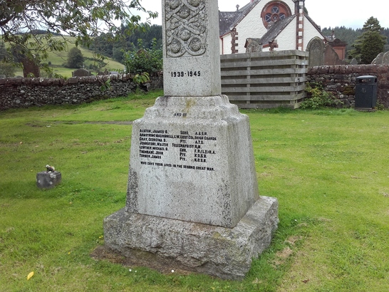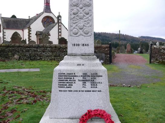 WW1- Anderson Walter Black Watch Private/ Cameron Angus Cameron Highlanders Private/ Common Simon T.C. Kings Own Scottish Borderers Lance Corporal/ Currie James Kings Own Scottish Borderers Private/ Dodds Charles Kings Own Scottish Borderers Private/ Donaldson James Royal Scots Fusiliers Private/ Edgar William J. Gordon Highlanders Private/ Grossart Robert Dykes Royal Flying Corp Lieutenant/ Hastie John Kings Own Scottish Borderers Private/ Inglis Charles Kings Own Scottish Borderers Private/ Johnstone William Kings Own Scottish Borderers Private/ Kelly James Highland Light Infantry Sergeant/ Locke Charles Scots Scots Greys Trooper/ Locke William Kings Own Scottish Borderers Private/ Martin William Kings Own Scottish Borderers Lance Corporal/ Robertson David Kings Own Scottish Borderers Private/ Robertson James Kings Own Scottish Borderers Private/ Shankland James Argyle & Sutherland Highlanders Corporal/ Shelton John Thomas Cameron Highlanders Private/ Steel Archibald Kings Own Scottish Borderers Private/ Torrance Robert Canadians Canadian Highlanders Private/ Watson James Kings Own Scottish Borderers Private/ Waugh Adam Scots Guards Private/ Younger John Malcolm Coldstream Guards Captain/ WW2- Alston James B. Argyll & Sutherland Highlanders Sergeant/ Armstrong MacDonnell L.W. Irish Guards Lieutenant Colonel/ Gray Georgina S. A.T.S. Private/ Johnstone Walter Royal Navy Telegraphist/ Lowther Michael B. Royal Artillery F.R.(L.Y.)R.A. Gunner/ Tochrane John Kings Own Scottish Borderers Private/ Turner James Kings Own Scottish Borderers Private/