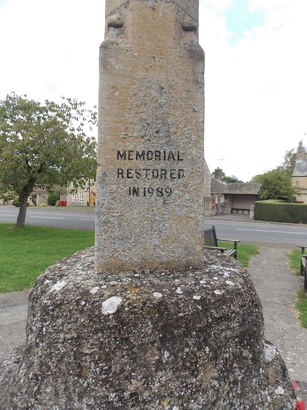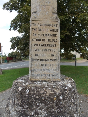 (West face) THIS MONUMENT THE BASE OF WHICH ONLY REMAINING STONE OF THE OLD VILLAGE CROSS WAS ERECTED IN 1920 IN UNDYING MEMORY OF THE MEN OF MARHOLM WHO FELL IN THE GREAT WAR. (East face) PRO PATRIA 1914-1918 (9 names) (North face) 1939-1945 (1 name) (South face) MEMORIAL RESTORED IN 1989