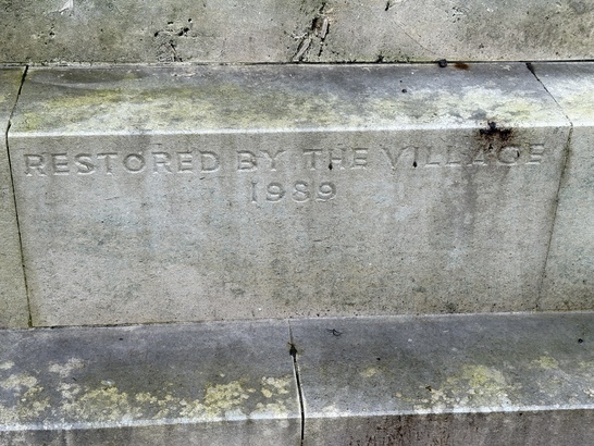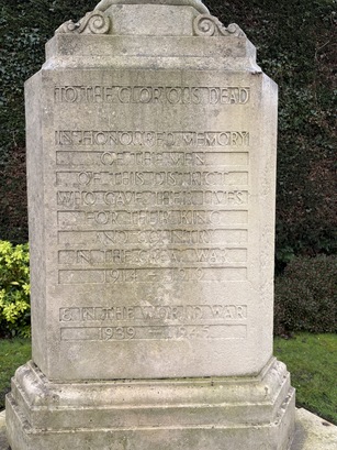Two sides of the base bear the names of the fallen. The third is inscribed TO THE GLORIOUS DEAD/IN HONOURED MEMORY/OF THE MEN /OF THIS DISTRICT/WHO GAVE THEIR LIVES/FOR THEIR KING/AND COUNTRY/IN THE GREAT WAR/1914-1918/AND IN THE WORLD WAR/ 1939-1945. Carved above the three sundial faces are THE DAYS WERE SHORT and THE WORK GREAT and THEIR TIME PASSED AWAY LIKE A SHADOW.