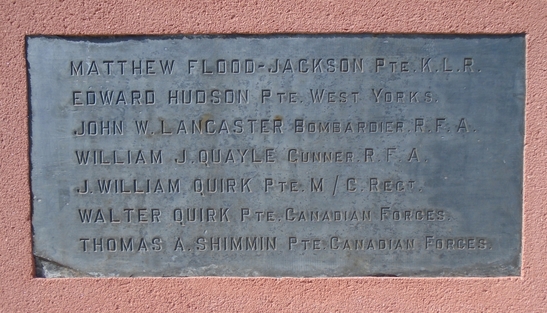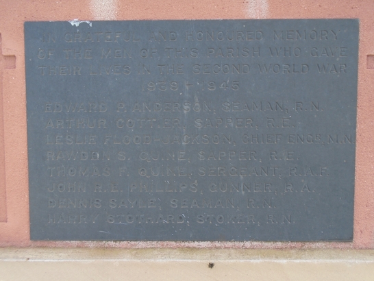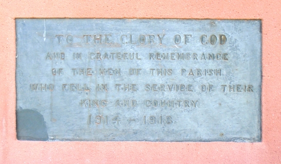 'To the glory of God / and in grateful remembrance / of the men of this parish / who fell in the service of their / king and country / 1914-1918.' 18 names listed alphabetically; Also: 'In grateful and honoured memory / of the men of this parish who gave / their lives in the Second World War / 1939-1945.'