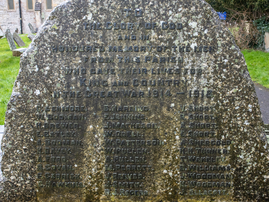 1914-1918 C A Ashmore, WBodman, H Brewer E Batley A Bodman H Davey A Ford B Govan F Gerrish G Hawkins B Harding F Jenkins J Matheson W Odell W Patterson W Pullen A Pullen M Perrett J Reeves J Smith R J Rogers V Short R J Short E Short A Shergold H H Turner T Wakele B Williams J Woodman H Woodman J Ellacott 1939-1945 T R Aubrey, L Brewer, F Barrnard, W Clark, S Hunt, F Fudge, A Fry, B Gready, J Morris, E A King, K W Martin, S Ollis, R Packer, D Stone,