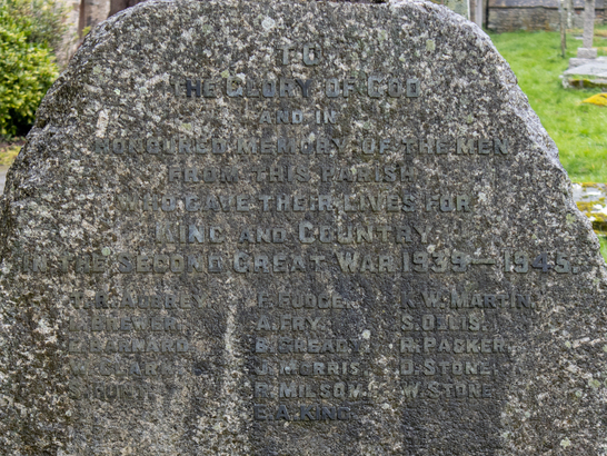 TO THE GLORY OFGOD AND IN HONOURED MEMORY OF THE MEN FROM THIS PARISH WHO GAVE THEIR LIVES FOR KING AND COUNTRY IN THE GREAT WAR 1914-1918 TO THE GLORY OF GOD AND IN HONOURED MEMORY OF THE MEN FROM THIS PARISH WHO GAVE THEIR LIVES FOR KING AND COUNTRY IN THE SECOND GREAT WAR 1939-1945