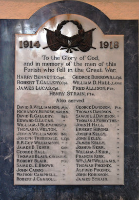 The fallen- Column 1- Harry Bennett Capt/ Robert T Gallery Cpl/ James Lucas Cpl Column 2- George Burrows LCpl/ William D Hall L Gnr/ Fred Allison Pte; Centred below the Columns- Henry Strain Pte