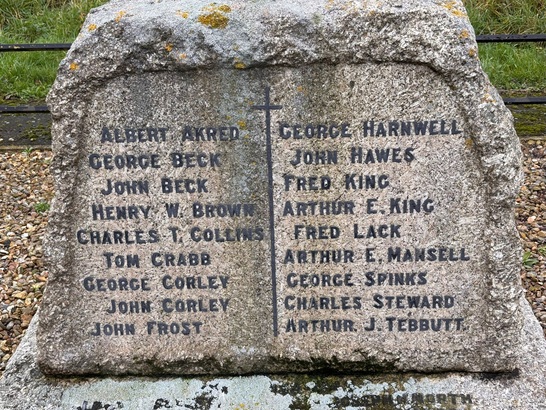 (1914-1919) ALBERT AKRED, GEORGE BECK, JOHN BECK, HENRY W. BROWN, CHARLES T. COLLINS, TOM CRABB, GEORGE CORLEY, JOHN CORLEY, JOHN FROST, GEORGE HARNWELL, JOHN HAWES, FRED KING, ARTHUR E. KING, FRED LACK, ARTHUR E. MANSELL, GEORGE SPINKS, CHARLES STEWARD, ARTHUR J. TEBBUTT. (1939-1945) ALFRED L. BECKETT, DOUGLAS F. HUNTER, REGINALD H. MANSELL, JOSEPH H. NORTH, ROBERT RUDD, AUBREY WATSON.