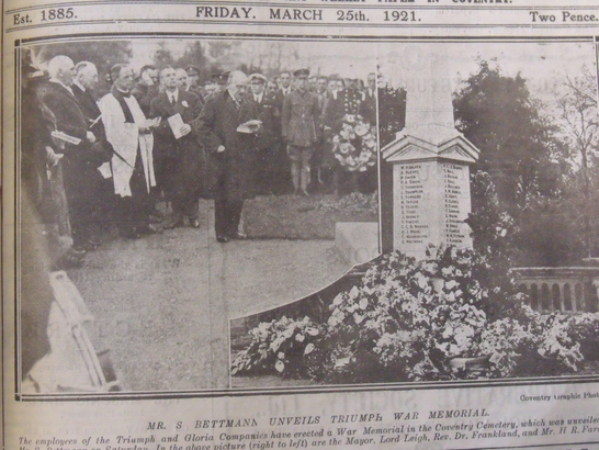 Historic image of the erected Triumph and Gloria factories memorials - Taken by Coventry Graphic Photos c/o FOLRC 19 Mar 1921
