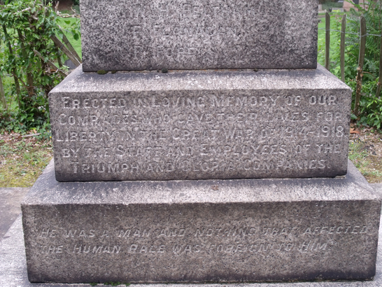 Erected in loving memory of our comrades who gave their lives for liberty in the Great War 1914-1918 by the staff and employees of the Triumph and Gloria companies. 'He was a man and nothing that effected the human race was foreign to him.'