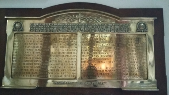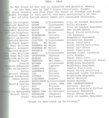 1914 - 1919 / TO THE GLORY OF GOD & IN HONOURED & GRATEFUL MEMORY OF THE MEN WHO BY/ GOD'S GRACE VICTORIOUS, FOUGHT FOR THEIR COUNTRY & DIED THAT THE CAUSE OF FREEDOM AND RIGHT MIGHT TRIUMPH IN THIS WORLD; AND MORE PARTICULARLY/ OF THE MEN OF THIS PARISH WHOSE NAMES ARE INSCRIBED HEREUNDER. / (Names) / "DEATH IS SWALLOWED UP IN VICTORY"