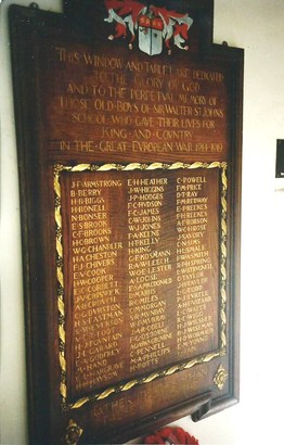 THIS WINDOW AND TABLET ARE DEDICATED/ TO THE GLORY OF GOD/ AND TO THE PERPETUAL MEMORY OF/ THOSE OLD BOYS OF SIR WALTER ST JOHN'S /SCHOOL WHO GAVE THEIR LIVES FOR/ KING AND COUNTRY/ IN THE GREAT EUROPEAN WAR 1914-1919/ (78 names)/ RATHER DEATHE THAN/ FALSE OF FAYTHE