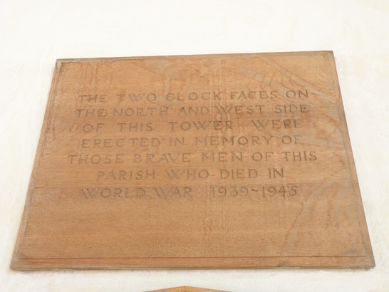 THE TWO CLOCK FACES ON/ THE NORTH AND WEST SIDE/ OF THIS TOWER WERE/ ERECTED IN MEMORY OF/ THOSE BRAVE MEN OF THIS/ PARISH WHO DIED IN/ WORLD WAR 1939 - 1945