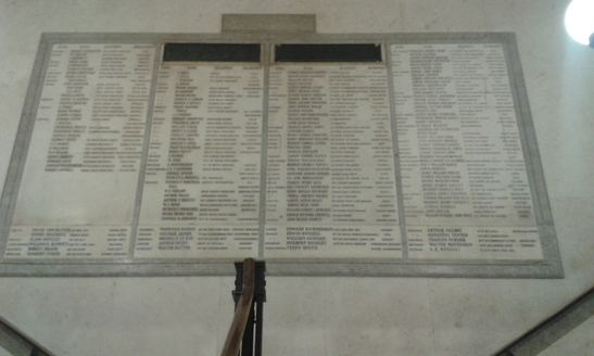 Pediment: 1914-1918/ WAR MEMORIAL (left to right) Tablet 1: RANK/ NAME/ REGIMENT/ DEPARTMENT (Names) Tablet 2: HARRODIANS WHO DIED FOR THEIR COUNTRY/ 1914 - 1918/ RANK/ NAME/ REGIMENT/ DEPARTMENT (Names) Tablet 3: HARRODIANS WHO DIED FOR THEIR COUNTRY/ 1914 - 1918/ RANK/ NAME/ REGIMENT/ DEPARTMENT (Names) Tablet 4: RANK/ NAME/ REGIMENT/ DEPARTMENT (Names)