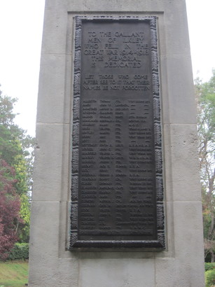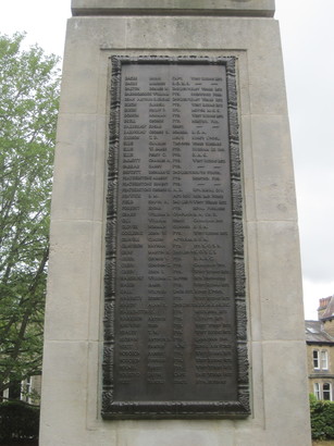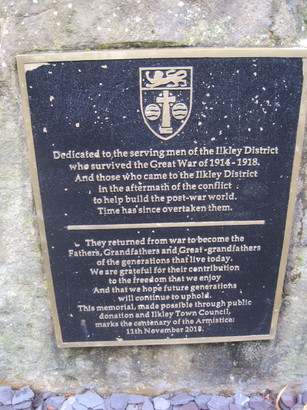 ON CENOTAPH: TO THE GALLANT MEN OF ILKLEY/ WHO FELL IN THE GREAT WAR OF/ 1914-1918 THIS MEMORIAL IS/ DEDICATED/ LET THOSE WHO COME AFTER/ SEE TO IT THAT THEIR NAMES/ BE NOT FORGOTTEN/ (NAMES)/