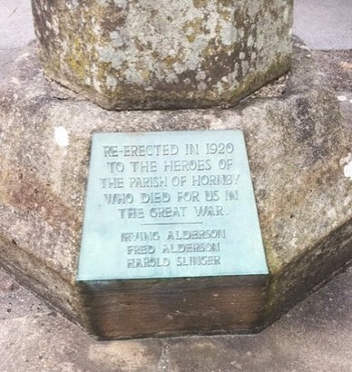 Re-erected in 1920 to the heroes of the parish of Hornby who died for us in the Great War. In memory of the men of Hornby who fell in the 1939 - 45 war. War Memorial, 1920 with medieval remains. Sandstone. A chamfered octagonal cross base, removed from its former position in front of the demolished Town Hall, stands on 2 steps of square plan. Above is a tapering octagonal shaft, of 1920, with a head of square plan under a gable, carved with figures. It is surmounted by a cross. On the east side of the octagonal base is a plaque inscribed: 'Re-erected in 1920 to the Heroes of the Parish of Hornby.' On the west side a plaque records the dead of the 1939-45 war c Historic England listing entry