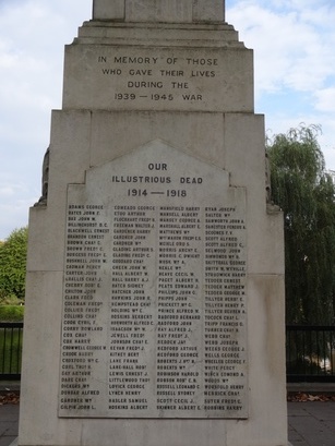 [Incised at top, front] In memory of those / who gave their lives / during the / 1939-1945 war / [front plaque] Our / illustrious dead / 1914-1918 / [names] [left plaque] [names] [rear plaque] 1939-1945 / [names] / And all those who lost their lives from / enemy action in this area / [rear addendum plaque] [names] [right plaque] [names]