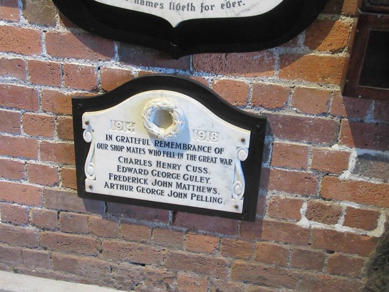 1914 - 1918 / In grateful remembrance of / our shop mates who fell in the Great War // Charles Henry Cuss / Edward George Guley / Frederick John Matthews / Arthur George John Pelling