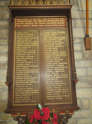 Harry Ayres, Frederick Brown, Nelson Benger, Thomas James Benger, Harry Burgess, Arthur Russell Baily, Ernest Stanley Barnes, Norman Frederick Button, James Brimson, Ralph Butt, Frederick Collins, John Chesterman, Norman Case, William Curwen, William Donson, John Eade, William Fricker, Graham Grant, Herbert Russell Greenland, Basil Gummer, Alfred Thomas Hamblin, Clement Harry Horwood, Thomas Holt, Lionel Harvey, Edward James Harvey, Reginald Howard, Frederick James Harrison, Adolphus Lynch, Charles Lee, Reginald Moody, Clarence Andrew Moldram, Willm. Lionel Gueritz Mortimer, Henry Maidment, Wilfred Oakes, Louis Paynter, Bertram Oliver Penny, Samuel Clement Pickford, Frank Phillips, Ronald Rigg, Arthur John Richards, William Henry Rebbeck, Frederick Russell, Oliver James Short, Montague Smith, Reginald Stocking, Victor Smith, Victor Slade, Walter Charles Sparey, Albert Edward Sparrow, Herbert Elsmere Speller, Henry Stillman, William Stillman, Arthur Stagg, Albert James Sherstone, Frederick Turner, John William Thompson, Stanley Thompson, Charles Thompson, Alec Taylor, Robert Bruce Tucker, Lewis john Harvey Vallis, John Weasey, Arthur Wheeler, William John Wills, Hugh Witcomb, Frank Webley, Frederick James White, Albert Edward White, James Withey, John Hedley Wright Yerbury, Charles Young.