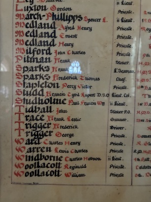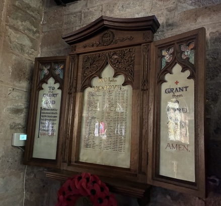 (left panel) TO / the / GLORY / Of / GOD / & / In Memory of the / men connected with / this Parish who gave / their lives for their / King & Country / in the Great / European WAR / 1914 - 1919. (centre panel) ROLL / OF / HONOUR. / [names] (right panel) GRANT / them / O / LORD / Eternal Rest, / & may Light / perpetual / shine upon / them. / AMEN