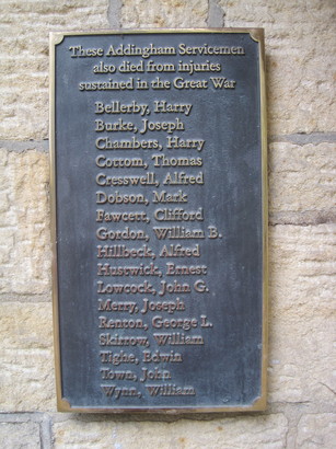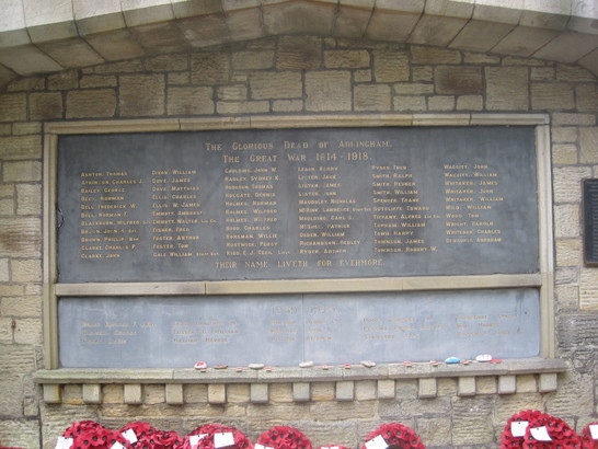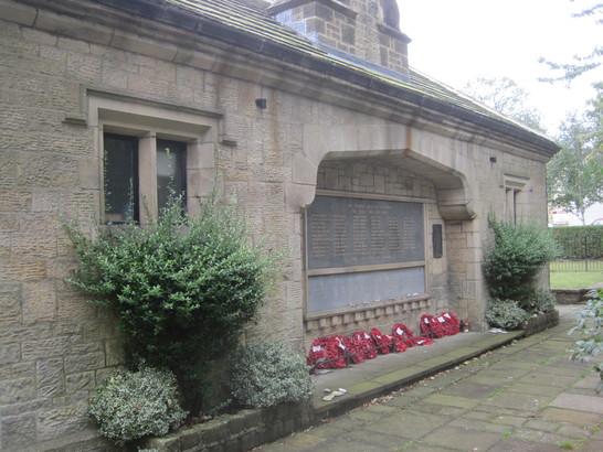 WW1- Column 1- Ashton Thomas/ Atkinson Charles J/ Bailey George/ Beck Norman/ Bell Frederick W/ Bell Norman F/ Blackburn Wilfred Sgt/ Brown John H Sgt/ Brown Phillip Bdr/ Clarke Charles P/ Clarke John; Column 2- Dixon William/ Dove James/ Dove Matthias/ Ellis Charles/ Ellis W James/ Emmott Ambrose/ Emmott Walter Lce Cpl/ Fisher Fred/ Foster Arthur/ Foster Tom/ Gale William Staff Sgt; Column 3- Goulding John W/ Hadley Sydney K/ Hodgson Thomas/ Holgate Dennis/ Holmes Norman/ Holmes Wilfred/ Hood Charles/ Horsman Willie/ Hustwick Percy/ Kidd E J Cecil Lieut; Column 4- Leach Harry/ Lister Jack/ Lister James/ Lister John/ Maudsley Nicholas/ McRink Lawrence Staff Sgt/ Moulding Carl S/ McShee Patrick/ Ogden William/ Richardson Hedley/ Ryder Arthur; Column 5- Ryder Fred/ Smith Ralph/ Smith Reuben/ Smith William/ Spencer Frank/ Sutcliffe Edward/ Tiffany Alfred Lce Cpl/ Topham William/ Town Harry/ Townson James/ Townson Robert W; Column 6- Waggitt John/ Waggitt William/ Whitaker James/ Whitaker John/ Whitaker William/ Wild William/ Wood Tom/ Wright Harold/ Whiteoak Charles/ Dewhurst Abraham; WW2- Column 1- Brace, Eustace F Lieut/ Dickson George/ Drake James; Column 2- Egan Laurence M/ Foster C William/ Hillman Neville; Column 3- Milburn Dennis C/ Melville John S/ Newton Stephen; Column 4- Oddy Geoffrey N/ Perkins Thomas Lce Cpl/ Stapleton Jack; Column 5- Turnpenny Ernest/ Wall Hubert/ Woodfield James H; The Additional Tablet- Bellerby, Harry/ Burke, Joseph/ Chambers, Harry/ Cottom, Thomas/ Cresswell, Alfred/ Dobson, Mark/ Fawcett, Clifford/ Gordon, William B/ Hillbeck, Alfred/ Hustwick, Ernest/ Lowcock, John G/ Merry, Joseph/ Renton, George L/ Skirrow, William/ Tighe, Edwin/ Town, John/ Wynn, William