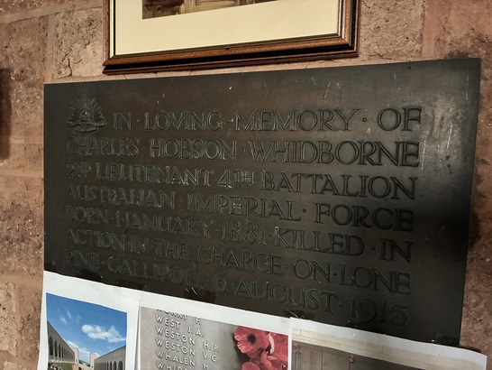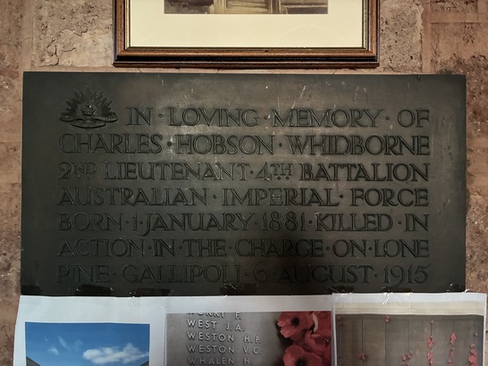 IN LOVING MEMORY OF / CHARLES HOBSON WHIDBORNE / 2ND.. LIEUTENANT 4TH.. BATTALION / AUSTRALIAN IMPERIAL FORCE / BORN 1 JANUARY 1881 KILLED IN / ACTION IN THE CHARGE ON LONE / PINE GALLIPOLI 6 AUGUST 1915