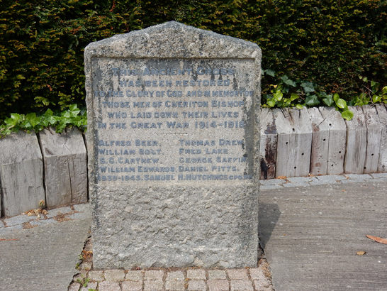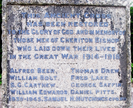 THIS ANCIENT CROSS / HAS BEEN RESTORED / TO THE GLORY OF GOD AND IN MEMORY OF / THOSE MEN OF CHERITON BISHOP / WHO LAID DOWN THEIR LIVES / IN THE GREAT WAR 1914-1918 / (8 names in 2 columns) / 1939-1945. (1 name)
