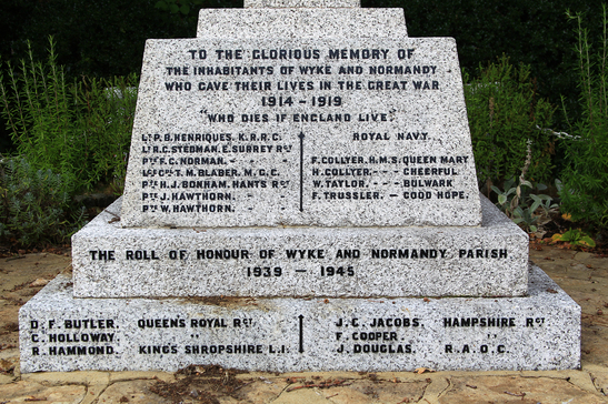 TO THE GLORIOUS MEMORY OF / THE INHABITANTS OF WYKE AND NORMANDY / WHO GAVE THEIR LIVES IN THE GREAT WAR / 1914-1919 / "WHO DIES IF ENGLAND LIVE" / (NAMES)