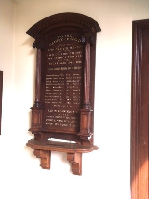 To the Glory of God/and in/ever grateful memory/of the/men of this church/and school who fell/in the/Great War 1914-1918/ Their name liveth for evermore/names/and in commemoration/of the/gallant service of thse who have/returned. many with grievous/wounds and enfeebled health.