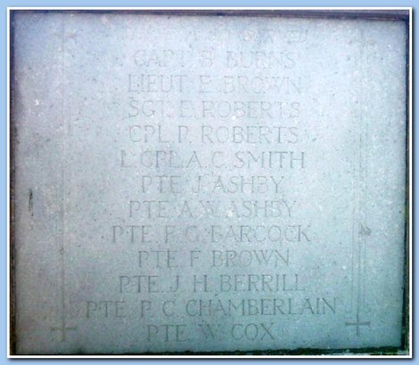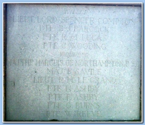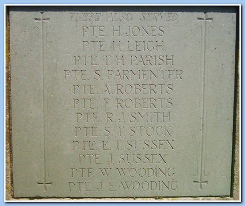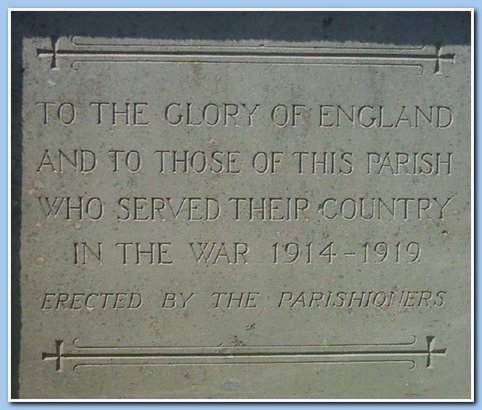Front face : TO THE GLORY OF ENGLAND AND TO THOSE OF THIS PARISH WHO SERVED THEIR COUNTRY IN THE WAR 1914 - 1919 ERECTED BY THE PARISHIONERS Opp. face : KILLED (NAMES) WOUNDED (NAMES) Adjacent faces : THESE ALSO SERVED (NAMES)