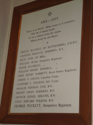 PRINCE MAURICE OF BATTENBURG, K.R.R.C. / GRAHAM PERCIVAL SHEDDEN, R.A. / ISAAC FOSS, I.W.Rifles. / WILLIAM BUSH, Hampshire Regiment. / FRANK PLUMBLEY, " " / WILLIAM HENRY MOSDELL " / JOHN HENRY BARRETT, Royal Sussex Regiment. / JOSEPH C. GRACE, Canadian Corps. / CLIFFORD J. TOLMAN, R.E. Corps. / FRANCIS THOMAS COX, R.N. / ERNEST OWEN JOHNSON, R.N. / ARTHUR LIONEL SHEATH, R.N. / CECIL EDWARD WILKINS, R.N. / GEORGE PUCKETT, Hampshire Regiment.