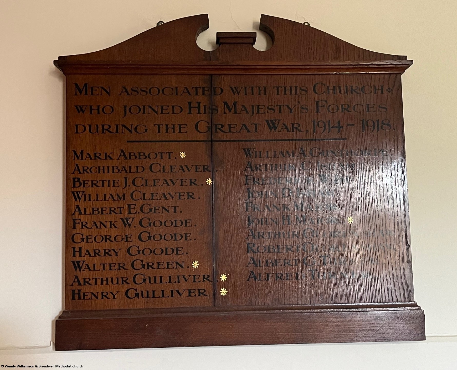 MARK ABBOTT*; ARCHIBALD CLEAVER; BERTIE J. CLEAVER*; WILLIAM CLEAVER; ALBERT E. GENT; FRANK W. GOODE; GEORGE GOODE; HARRY GOODE; WALTER GREEN*; ARTHUR GULLIVER*; HENRY GULLIVER*; WILLIAM GUNSTHORPE; ARTHUR ESHAM; FREDERICK ESHAM; JOHN ESHAM; FRANK MAJOR; JOHN MAJOR*; ARTHUR OLORENSHAW; ROBERT OLORENSHAW; ALBERT TURNER; ALFRED TURNER * = Men Who Fell