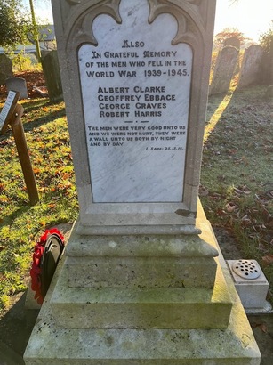 (WW1) JONATHAN BERRY/ VICTOR T. EDWARDS/ LIONEL W. GREEN/ FREDERICK J. GREEN/ ERNEST W. GRAVES/ JOHN HAGAN/ BARTLETT HART/ SIDNEY HIPKIN/ WILLIAM F. LYON/ FREDERIC S. SIDELL/ ROBERT TUTTLE/ FREDERICK C. WARD. (WW2) ALBERT CLARKE/ GEOFFREY EBBAGE/ GEORGE GRAVES/ ROBERT HARRIS