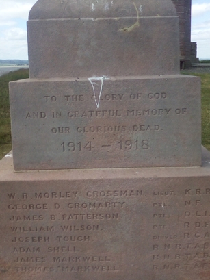 HOLY ISLAND, Beside Coastguard Station. On east face To the glory of God and in grateful memory of our glorious dead 1914 - 1918 W.R. Morley Crossman Lieut. K.R.R. George D. Cromarty Pte. N.F. James B. Patterson Pte. D.L.I. William Wilson Pte. R.D.F. Joseph Tough Driver R.G.A. Adam Shell R.N.R.T.A.B. James Markwell R.N.R.T.A.B. Thomas Markwell R.N.R.T.A.B. ----------------------------------------- On west face To the glory of God and in grateful memory of our glorious dead 1939 - 1945 Adam Shell Henderson R.N.R.T.A.B. Thomas Walker Stoker R.N. George Cromarty Douglas, Sgt. R.A. NEWMP H65.01