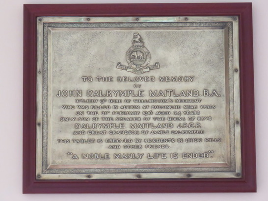 'To the beloved memory / of / John Dalrymple Maitland B.A. / 2nd Lieut. 9th Duke of Wellington Regiment / who was killed in action at Boesinche near Ypres / on the 21st February 1916 aged 24 years / only son of the Speaker of the House of Keys / Dalrymple Maitland J.P., C.P., / and great grandson of James Dalrymple. / This tablet is erected by the residents of Union Mills and other friends. / 'A noble manly life is ended.' '