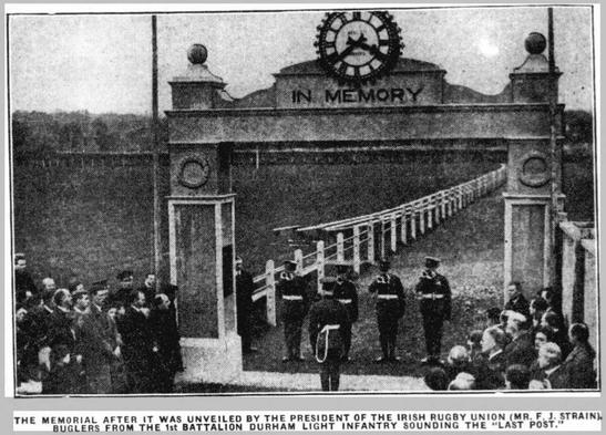 Buglers from 1st Battalion Durham Ligh Infantry sound the Last Post following the official opening by Mr F J Strain, President of the I.R.F.U. - Taken by Published in Larne Times 30th January 1926 22 Jan 1926