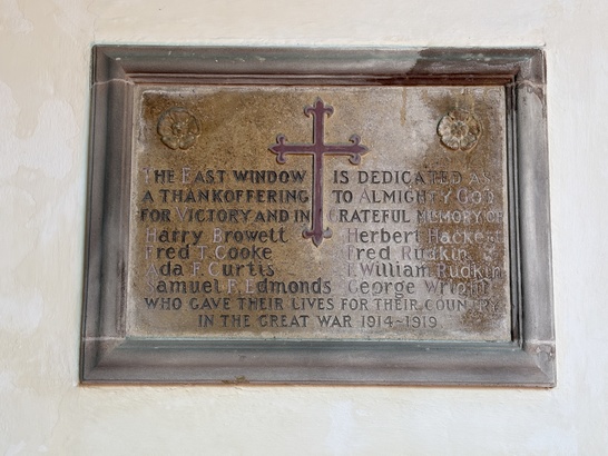 Window: GREATER LOVE HATH NO MAN THAN THIS, THAT A MAN LAY DOWN HIS LIFE FOR HIS FRIENDS Tablet : THE EAST WINDOW IS DEDICATED AS / A THANKOFFERING TO ALMIGHTY GOD / FOR VICTORY AND IN GRATEFUL MEMORY OF / (NAMES) / WHO GAVE THEIR LIVES FOR THEIR COUNTRY / IN THE GREAT WAR 1914 - 1919
