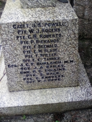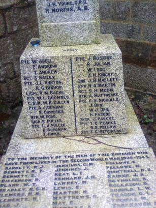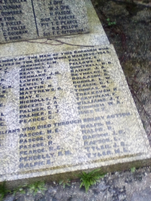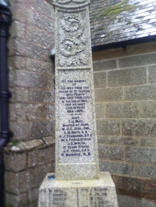 Pillar: TO THE MEMORY / OF / THE MEN FROM THE / PARISH OF ST GLUVIAS / WITH PENRYN / WHO GAVE THEIR LIVES / IN THE GREAT WAR, / THAT WE MIGHT / LIVE IN PEACE / 1914 - 1919. / NAVY / (Names) Plinth 6 o'clock face: ARMY/ (Names) Plinth 9 o'clock face: (Names) Plinth 3 o'clock face: (Names) Tablet: TO THE MEMORY OF THE MEN OF THIS BOROUGH WHO / GAVE THEIR LIVES IN THE SECOND WORLD WAR 1939 - 1945. / (Names) / ALSO THE CIVILIANS WHO DIED THROUGH ENEMY ACTION. / (Names)