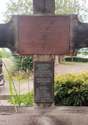 On the lychgate: Greater Love hath no Man than this, that a Man lay down his life for his friends. / August 4th, 1914 / November 11th, 1918 // On the WW1 plaque: TO THE GLORY OF GOD AND IN / GRATEFUL REMEMBRANCE OF THE MEN OF THIS PARISH / WHO SACRIFICED THEIR LIVES IN THE GREAT WAR / 1914 - 1918. / (Names) / "NOT ONE OF THEM IS FORGOTTEN" / ERECTED BY THE PARISHIONERS A.D. 1919. // On the WW2 plaque: IN GRATEFUL MEMORY OF / THE MEN OF THIS PARISH WHO GAVE / THEIR LIVES FOR THEIR COUNTRY / 1939 - 1945 / (Names) //