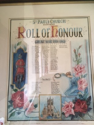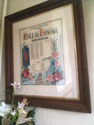 ST PAUL'S CHURCH/ SCOUTHEAD/ ROLL OF HONOUR/ GREAT WAR 1914 - 1918/ (Names)/ -THOSE WHO FELL-/ (Names)