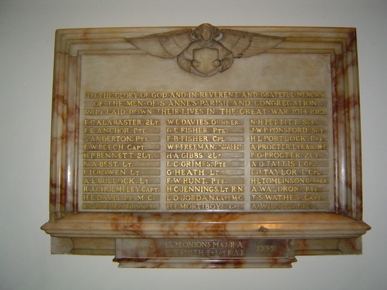 To The Glory Of God And In Reverent And Grateful Memory Of The Men Of St Anne’s Parish And Congregation Who Laid Down Their Lives In The Great War 1914-1919. 1939 AM Onions Maj RA EB Smith Ft Sgt RAF 1945