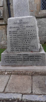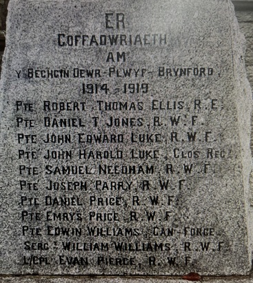 ER/ COFFADWRIAETH/ AM/ Y BECHGYN DEWR PLWYF - BRYNFORD/ 1914-1919/ (NAMES)/ 1939-1945/ (NAMES)
