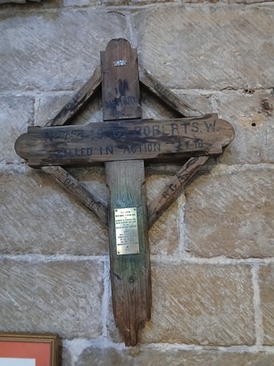 Cross: No 75449 ROBERTS. W./ KILLED IN ACTION 2-7-18/ R.G.A./ 21ST SIEGE BATTERY/ Plaque: THIS CROSS/ WHICH MARKED THE RESTING PLACE/ OF/ GUNNER W. ROBERTS RGA/ (KILLED IN ACTION JULY 2 1918)/ IN THE/ BRITISH MILITARY CEMETERY/ AT/ YPRES/ WAS PLACED IN/ TEWKESBURY ABBEY/ BY HIS WIDOW/ ON THE FIFTH/ ANNIVERSARY OF HIS DEATH/ R.I.P.
