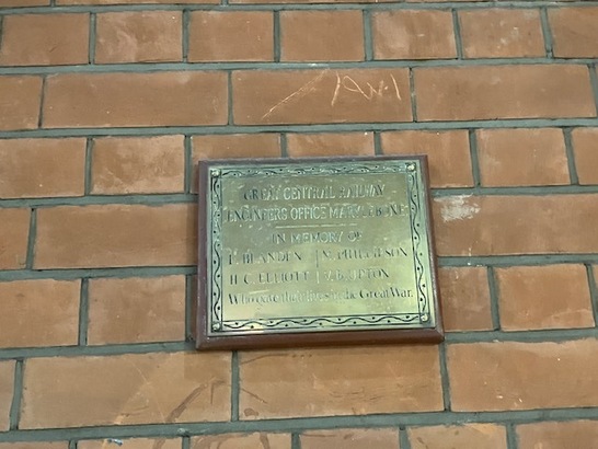 GREAT CENTRAL RAILWAY/ENGINEERS OFFICE MARYLEBONE/ In Memory Of/[names]/Who Gave their lives in the Great War.