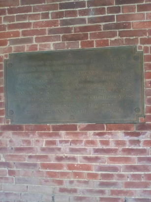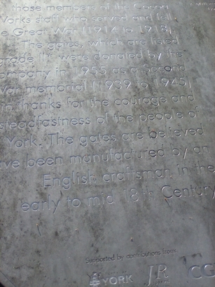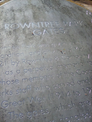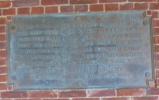 THE GATES AT THE RIVERSIDE ENTRANCE TO/ THIS PARK WERE GIVEN TO THE CITY OF YORK BY/ ROWNTREE & CO. LTD. IN MEMORY OF ALL THOSE/ FROM THE COCOA WORKS WHO LOST THEIR LIVES/ IN THE SECOND WORLD WAR (1939 – 1945) AND IN/ THANKSGIVING FOR THE COURAGE AND STEADFASTNESS/ OF THE PEOPLE OF YORK THROUGHOUT THOSE YEARS./ EXCEPT THE LORD KEEP THE CITY; THE WATCHMAN WAKETH BUT IN VAIN.