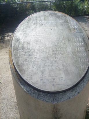 Bronze plaque recording gift of gates in lychgate inside park - Taken by J E S 28 Aug 2016